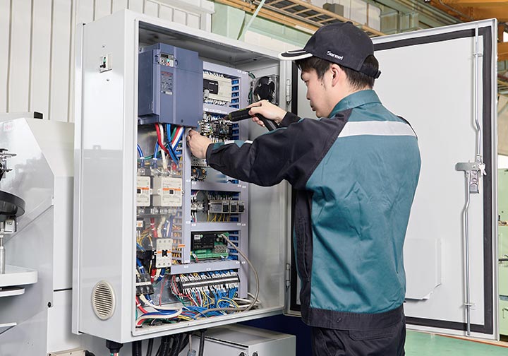 私が担当しているのは、弊社で生産している転造機の操作盤、制御盤の設計、動作プログラムの作成、電気関係の改造または修理です。お客様がより転造機を使いやすくなるようなプログラムを考え、初めての人でも安全、簡単に使えるよう様々な新機能を考察、検討しております。また、お客様の要望・ニーズに合わせて弊社の機械の修理や改造を行い、より長く使っていただけるように取り組んでいます。